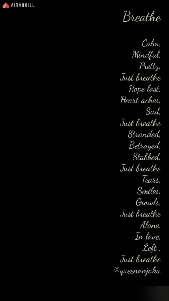 Even now that , I read this particular piece. I understand how simple life ought to be . For me “Breathe” is synonymous to Living and Growth Breathe as Living; I believe that living is an act of experience; the experience of the good and bad , high and the low. And no matter how we stray from the true act of living, we should remember that we live for the experience. Breathe as Growth ; I think it is safe to say that Living and Growth invariably go hand-in-hand. For if we live always with the conciousness that everything thing we go through , is for our growth and Living in itself our duty .Our world won’t be so unbearable.