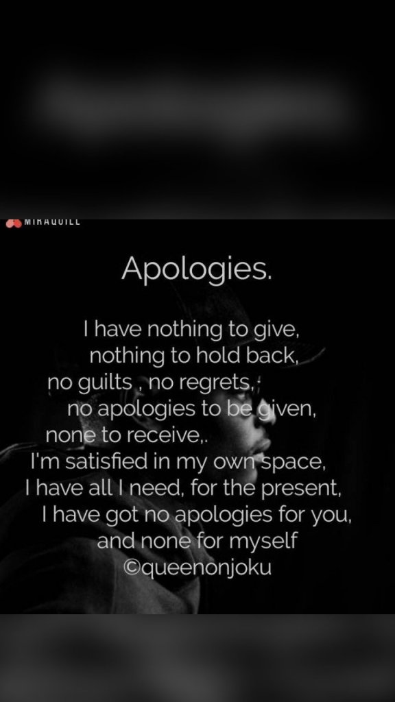 In my opinion “Apologies”comes from a serene place of self understanding , not only of this world but of the very fibres that connects us to the world ; to the other person. A place where we accept ourselves ; our short comings and successes not as an end in itself but as an ever growing process, never permanent and being “OK” with the situation. We also grow in that peaceful understanding of our neighbors not in a way where we predict their next actions or judge them but in such a way that we are continually open to their growth and change as well.