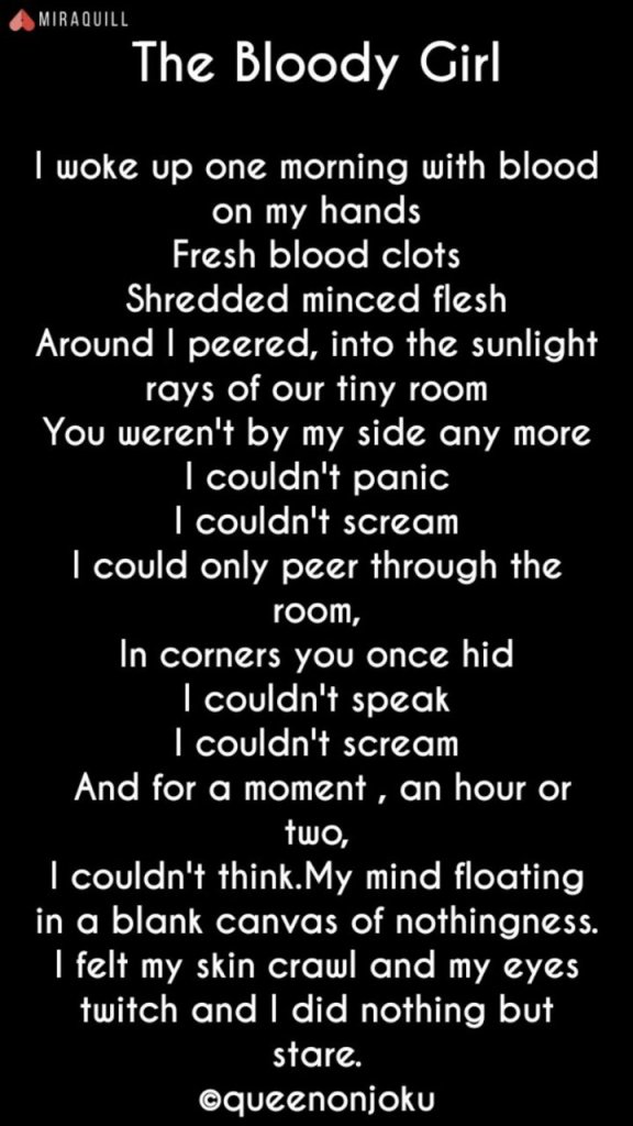 So today , I decided to do a rundown of today’s Entries. It’s a post with a bit of my thoughts on these four pieces of poetry; Apologies , Breathe ,Why do you begin again, Bloody Girl. All short Poetry and of course I love being spontaneous and reflective at that same time , so you will surely notice these effects.