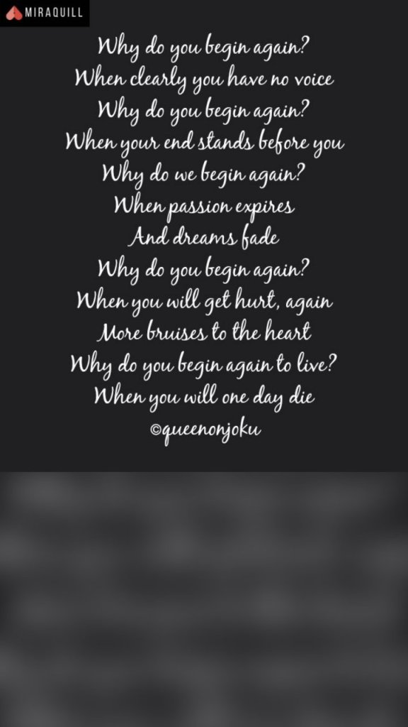 I particularly like this piece, because of its underlining theme of ” resilience” by asking series of provoking and some worth discouraging questions to a persona / reader. The questions are not rhetorical “Not deserving of an answer” but rather seeking to draw out the very answers which the persona provides after a reflective moment.